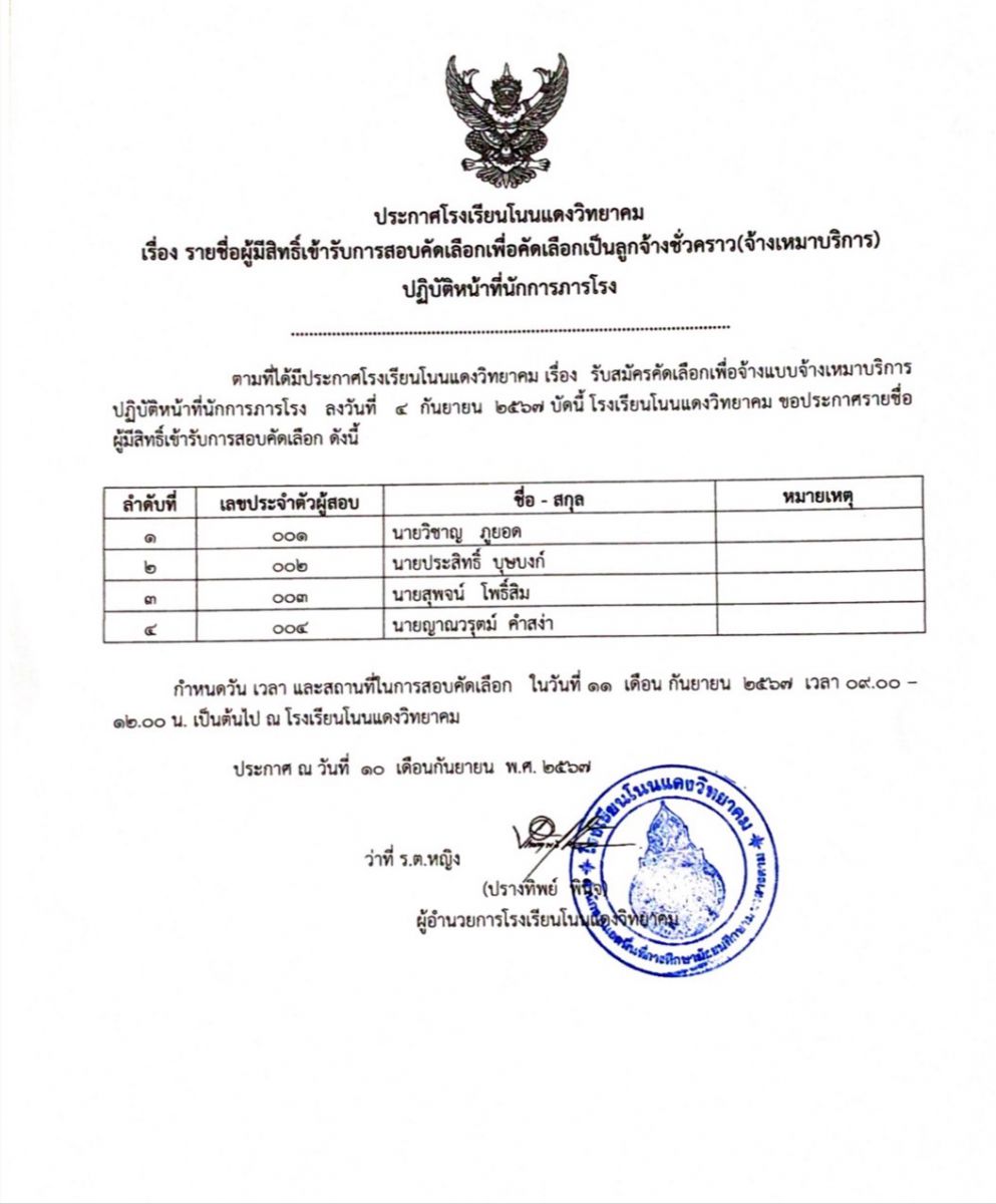 ประกาศผู้มีสิทธิ์สอบคัดเลือกลูกจ้างชั่วคราว(นักการภารโรง)